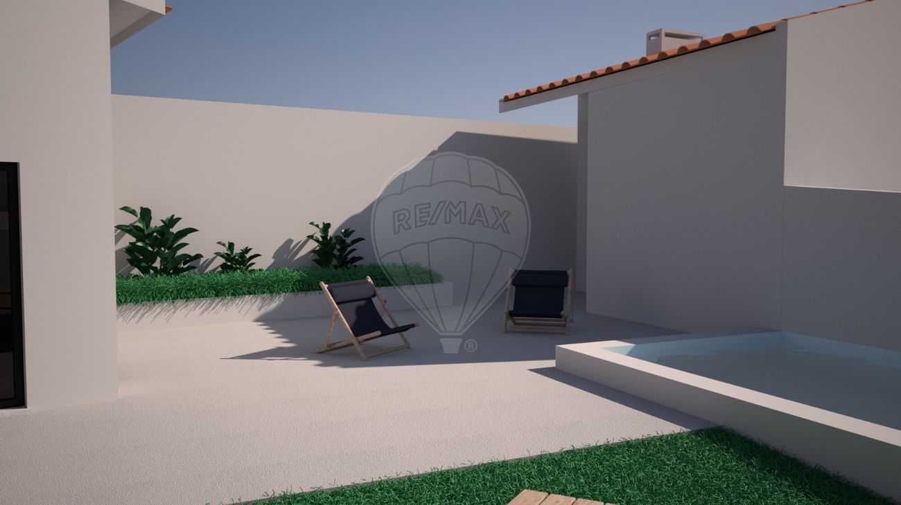 Um espaço com cerca de 280 m2, pensado para as horas de lazer permitindo o uso do espaço pelas duas casas, espaços de jardim e pequenas piscinas que se individualizam por um murete.