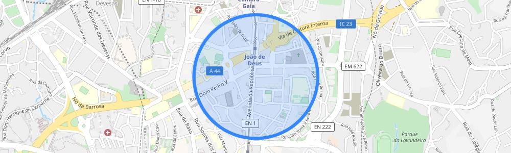 A localização do edificio é em plena Avenida da República, a 50mt do El Corte Ingles e a 60mt da estação de Metro João de Deus, a poucas centenas de metros tem acesso ao IC23 que permite chegar rapidamente ao Porto pelas pontes da Arrabida, Infante e Freixo assim como aceder à A1 ou à A29 no sentido sul.