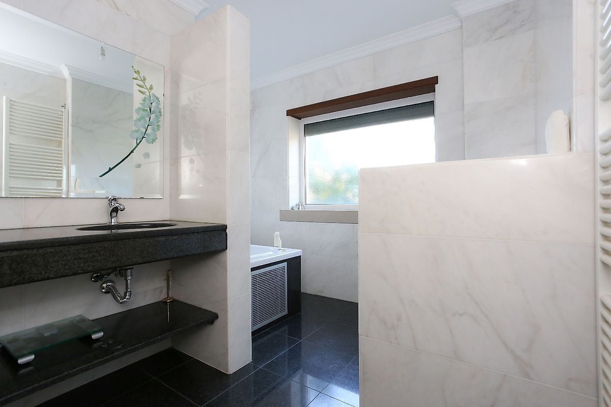 Rés do Chão com hall de entrada, sala de estar com lareira com recuperador de calor, sala de jantar, cozinha equipada, casa de banho completa, suíte com closet e casa de banho com banheira de hidromassagem.