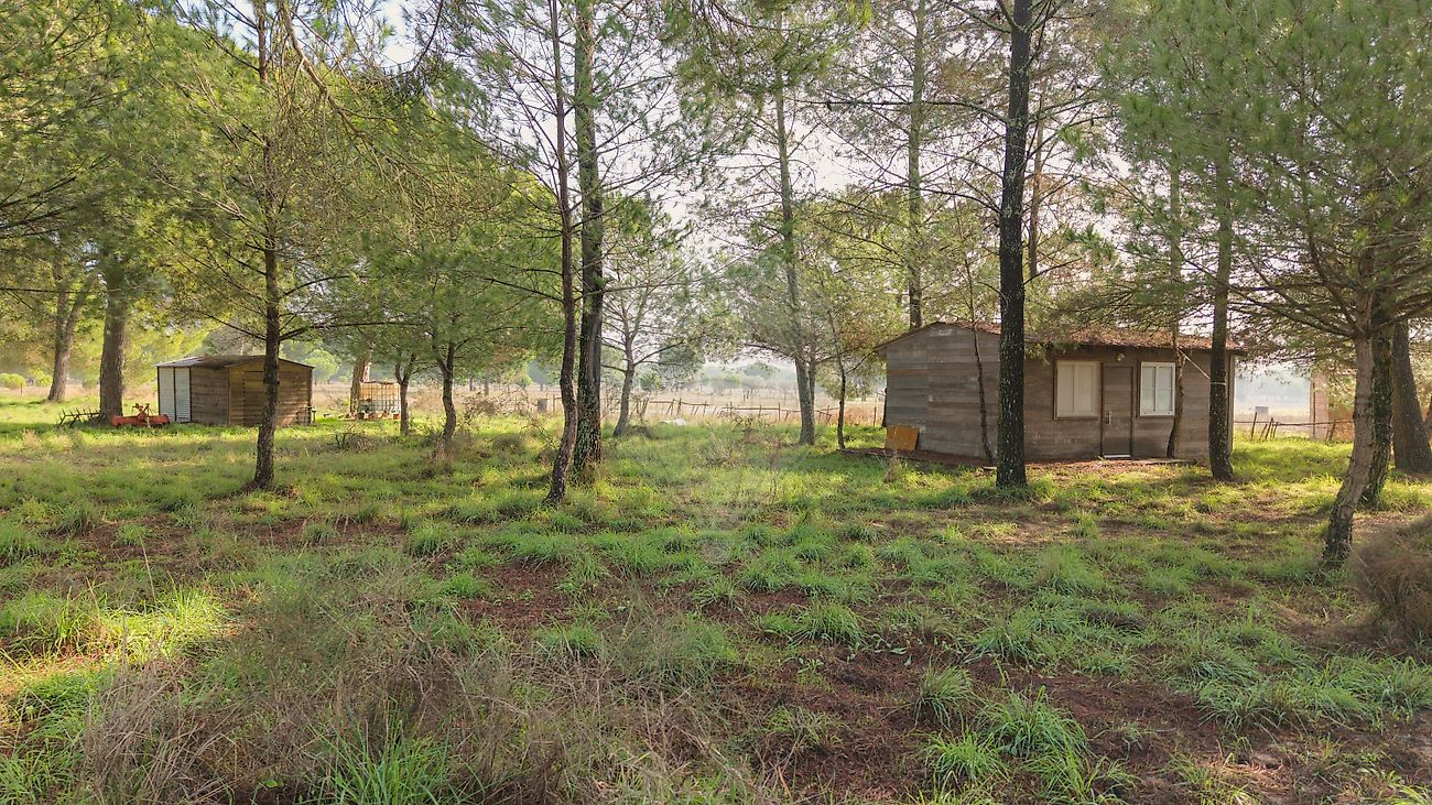 Dentro da área de mata, existem duas construções em madeira: um T0 com kitchenette e casa de banho, e uma garagem para armazenamento de equipamentos agrícolas.