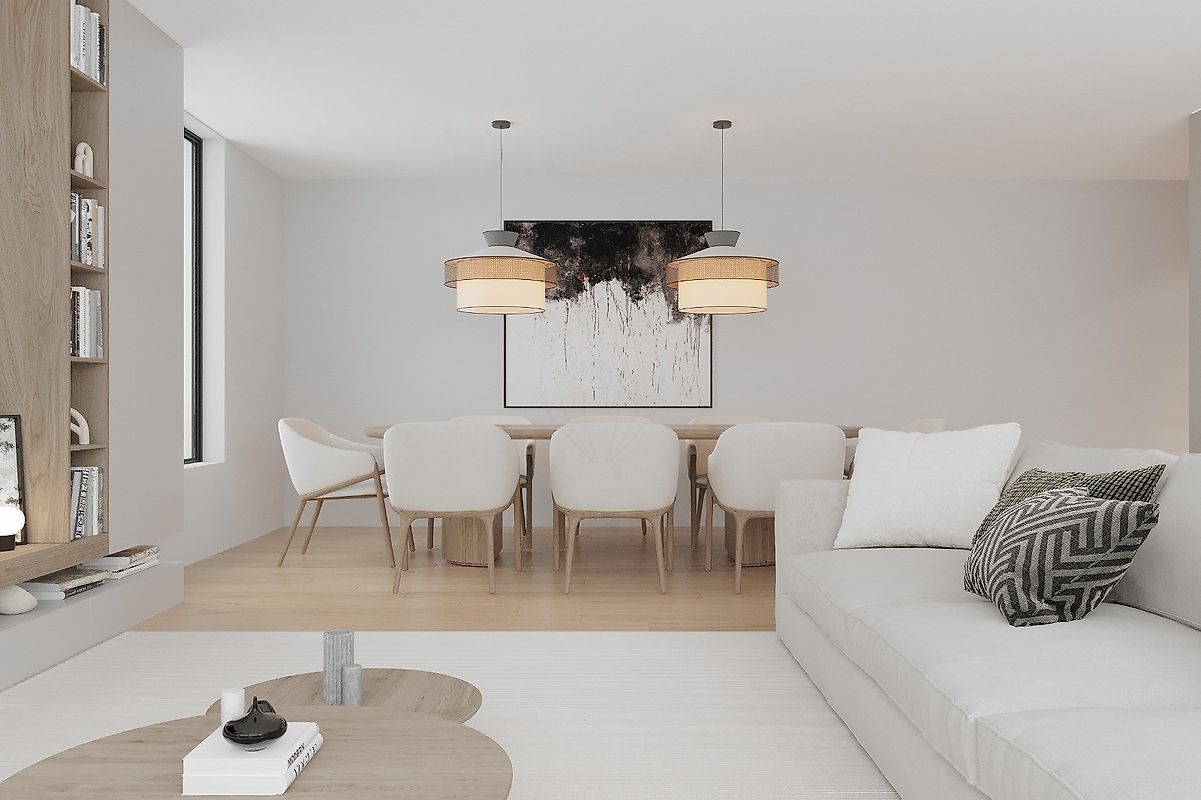 - Sala, Quartos e Áreas de Circulação: Pavimento vinílico em cor nogueira, carpintaria em madeira lacada, portas até ao teto e roupeiros embutidos com forro em melamina. Iluminação com fita de LED embutida no teto da sala.
