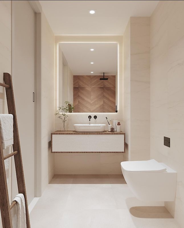 - Casas de Banho: Louças sanitárias suspensas da marca Rubicer, base de duche de espessura reduzida e misturadoras embutidas da marca Hapa. Revestimentos em grés porcelânico de grandes dimensões. Mobiliário suspenso com lavatório de cubas.