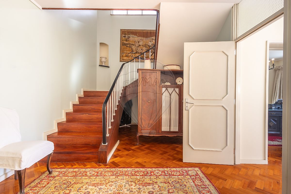 Um generoso hall e umas escadas em madeira com largura considerável, iluminadas por uma claraboia permitem o acesso ao piso superior onde um amplo hall pleno de luz e proporciona o acesso aos dois quartos com boas dimensões, assim como á suite