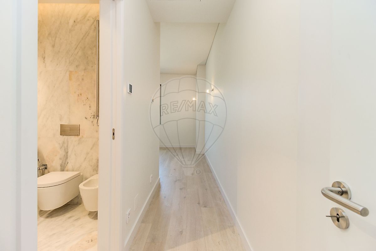 Hall de entrada (6,74 m2) com roupeiro, Sala (45,15 m2), orientada a nascente, com terraço (6,36 m2) e vista para o mar, piscina e jardins do condomínio, Cozinha americana equipada com eletrodomésticos SMEG, lavandaria, WC social (1,69 m2), 2 Suítes (21,31 e 19,82 m2) orientadas a poente com roupeiro, sendo que uma dispõe de banheira e outra de base de duche.
